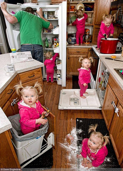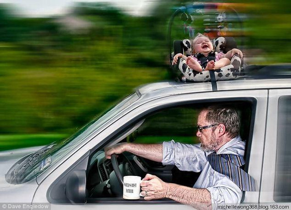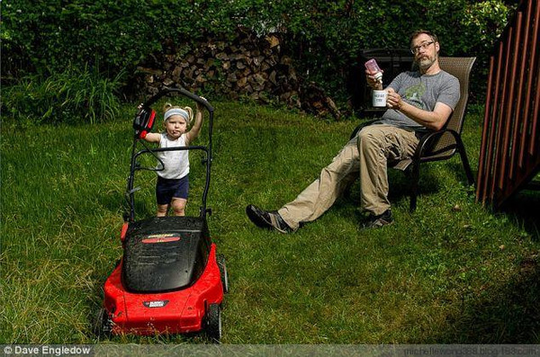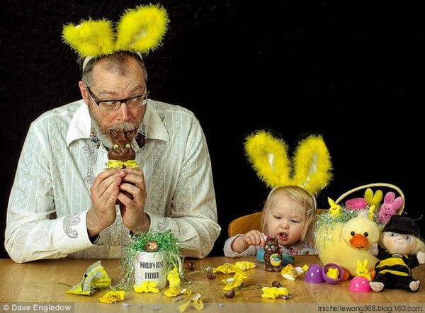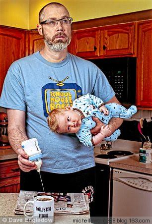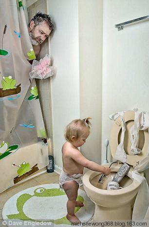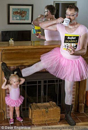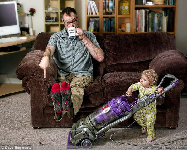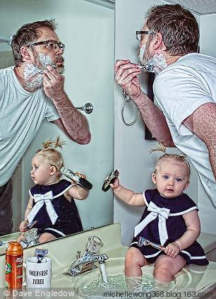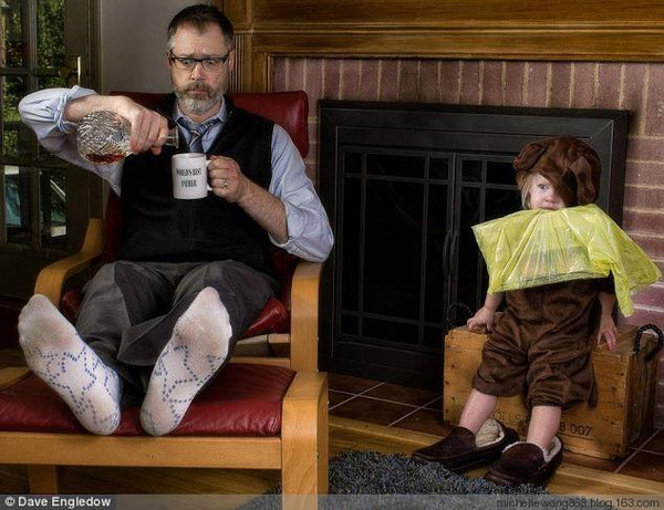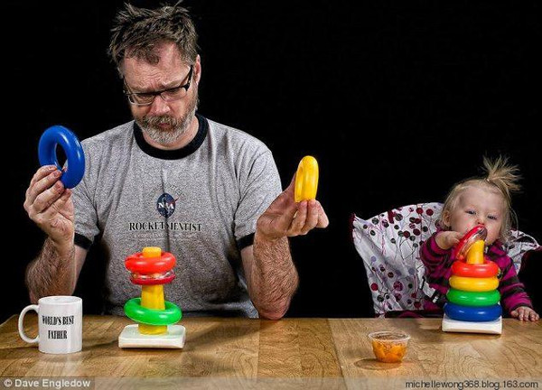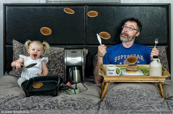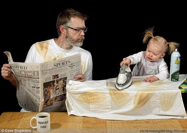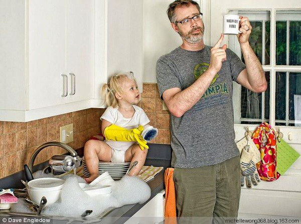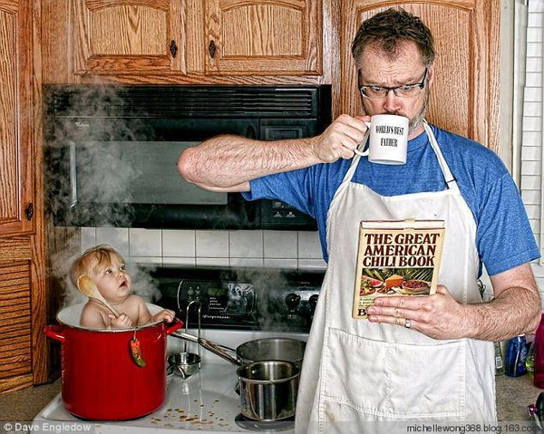 美国马里兰州Tahoma公园的一位父亲,叫戴夫恩格尔多,最近给自己和女儿拍摄了一组照片。照片上介绍他和女儿在妈妈不在的时候在家里做出的各种不可思议的举动。比如他把女儿忘记在饭锅里的样子,还有和女儿一起穿粉色衣服嬉戏的时刻。图片借助了ps稍微做了些润色,非常有喜感!