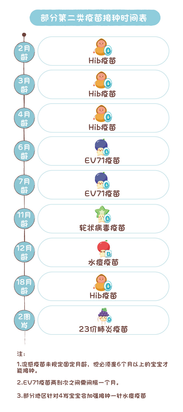 除了第一类疫苗,我国还有可自愿、自费接种的第二类疫苗,它们是第一类疫苗的有效补充。以下这6种疫苗也非常重要:b型流感嗜血杆菌疫苗(Hib)、轮状病毒疫苗、肺炎疫苗、水痘疫苗、EV71疫苗、流感疫苗。