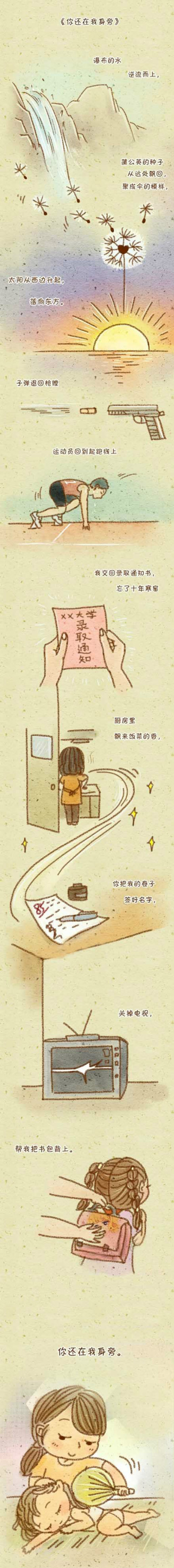 这是香港中文大学《独立时代》杂志,微情书征文大赛一等奖作品——《你还在我身旁》。这首诗,是一名不知名的作者写给已逝的母亲,用来缅怀对她的思念。作者希望时间能够倒流,一切的一切都能回到母亲在世的模样。假如,瀑布的水可以逆流而上,我能变回十年前的模样,母亲还能慈祥的陪伴在我身旁,可是,一切只是假如...